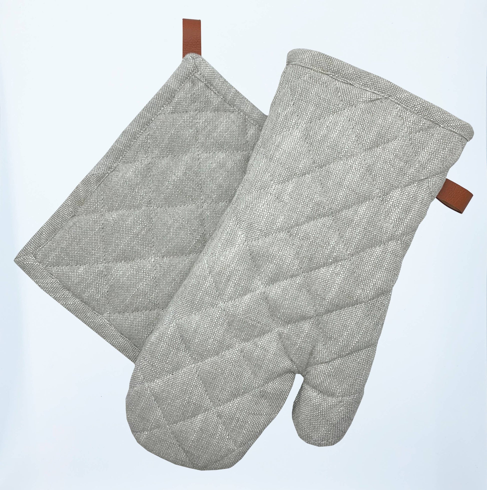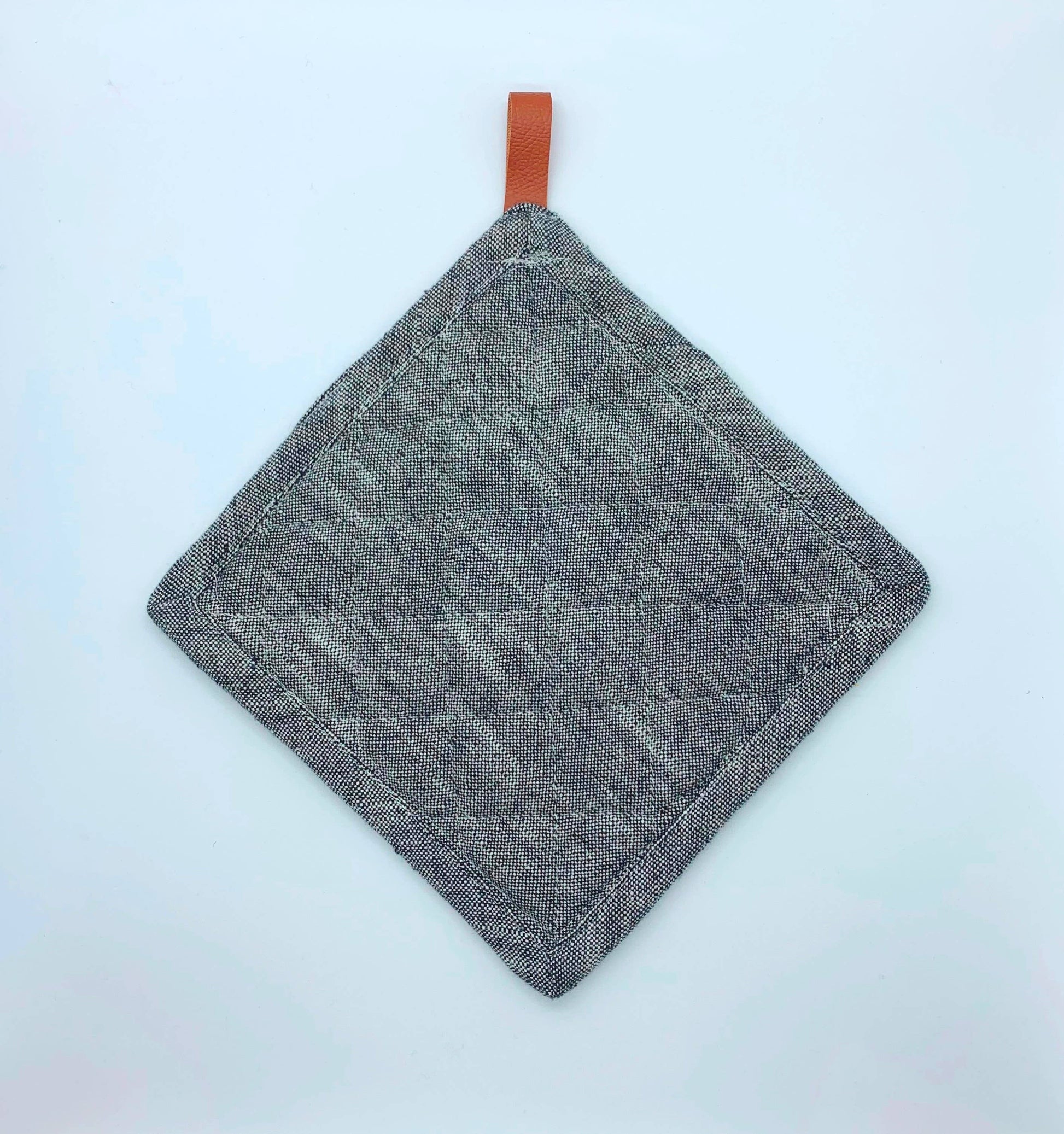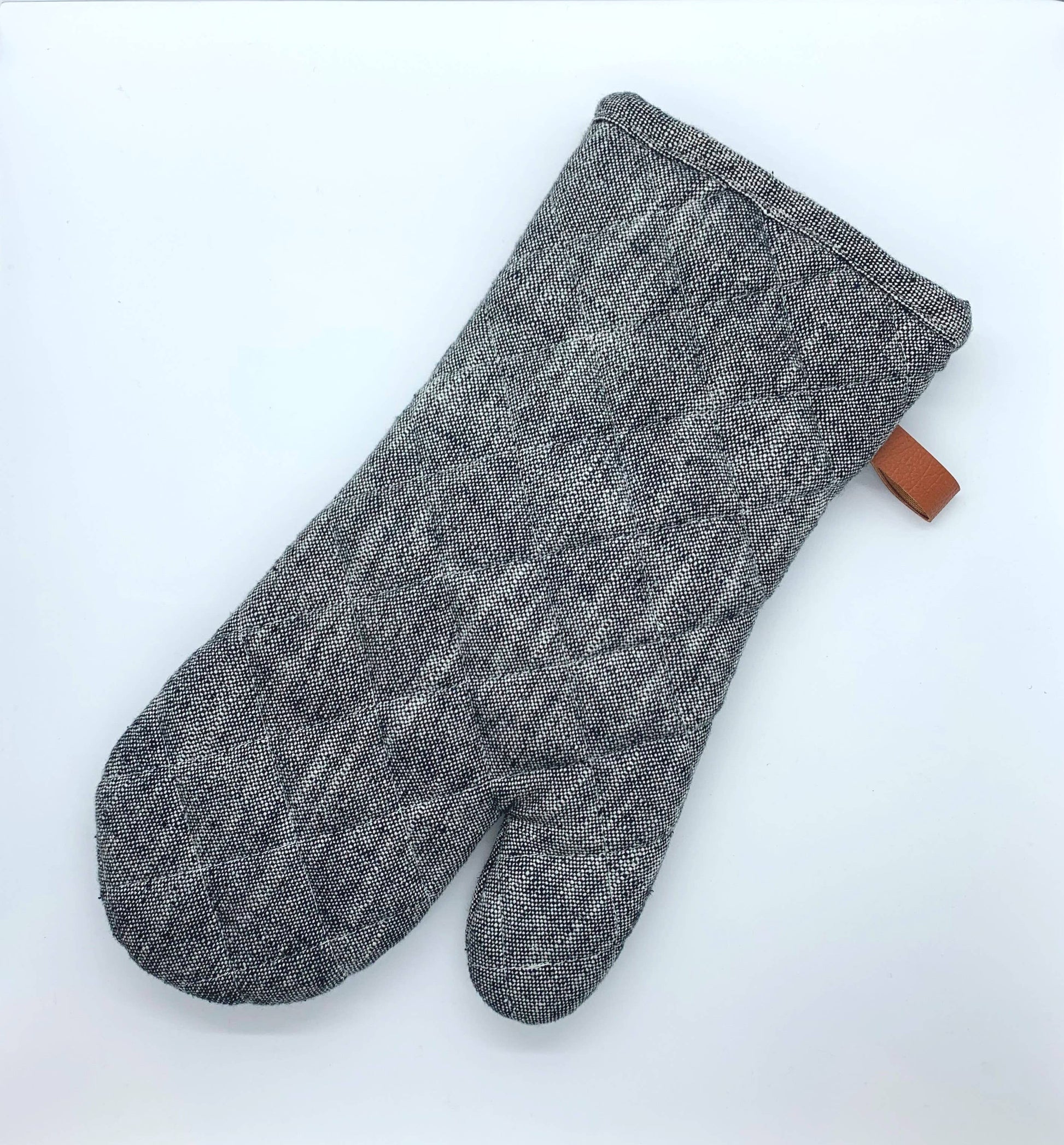 Chambray - cotton yarns weave together to create a beautifully rugged oven mitt & pot holder. The hanging loop provides a natural accent to the chunky, chambray-like fabric., for an elegantly industrial oven mitt that's built to last. This quilted mitt protects hands from hot pans and pairs perfectly with our aprons.