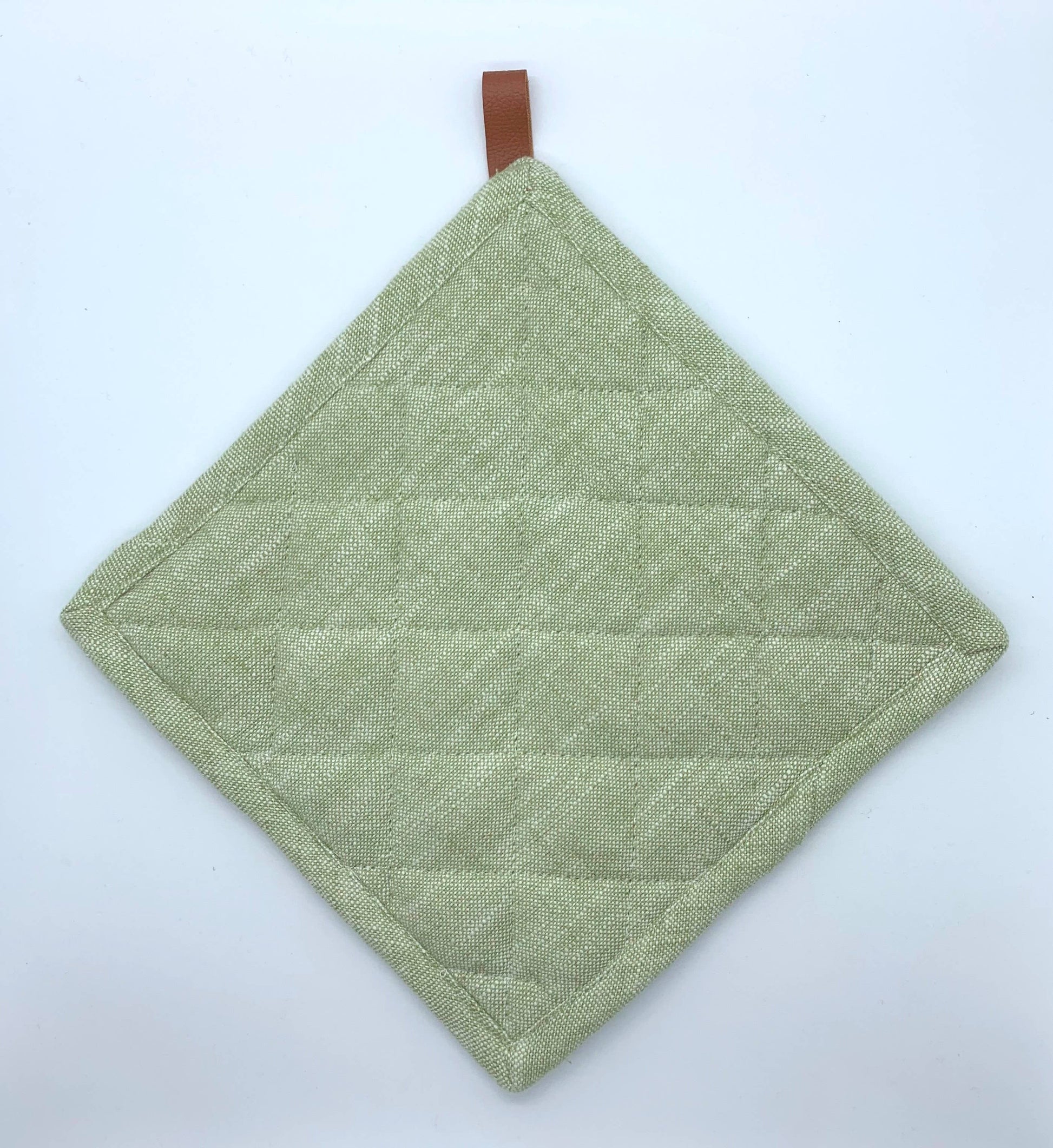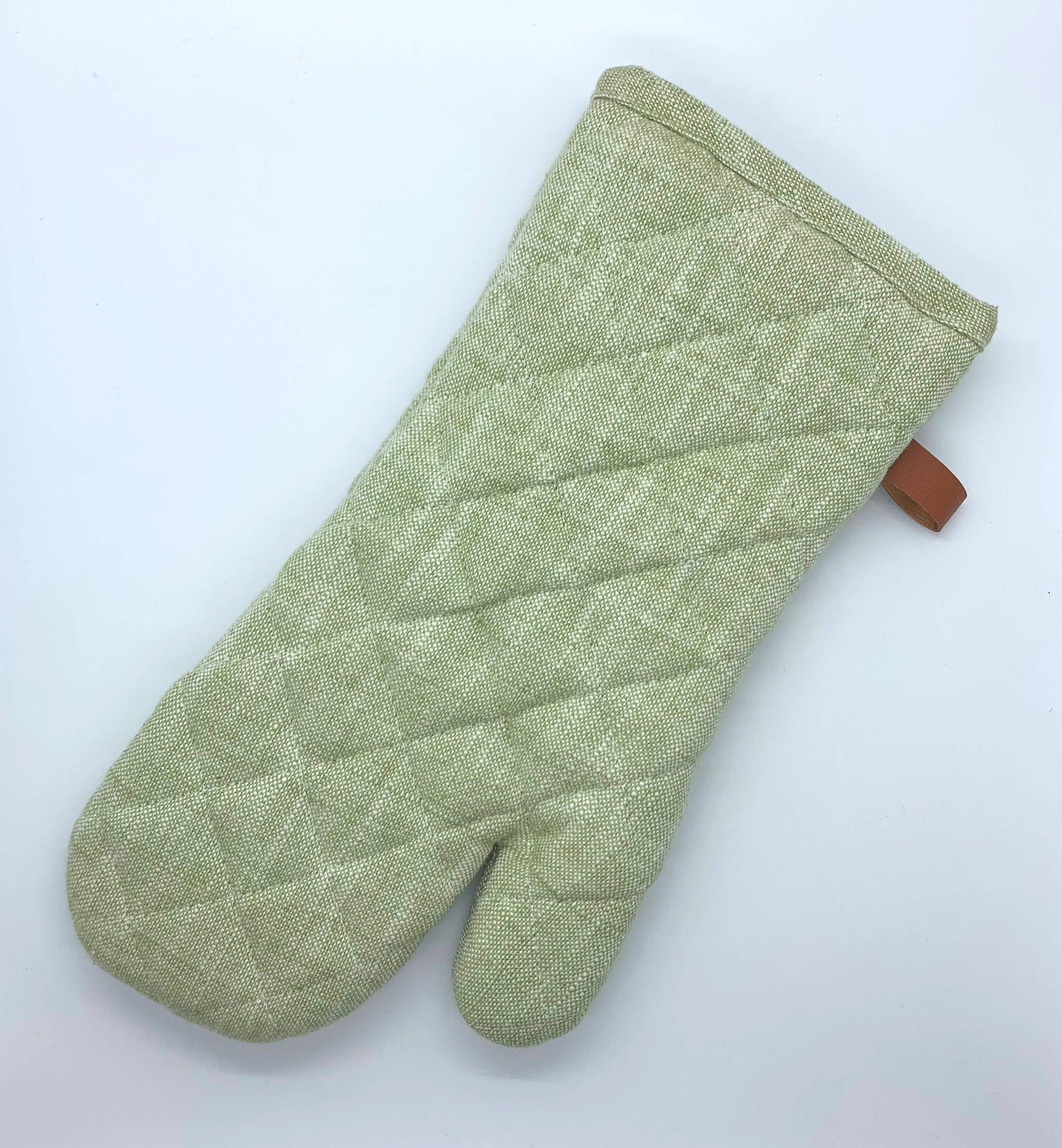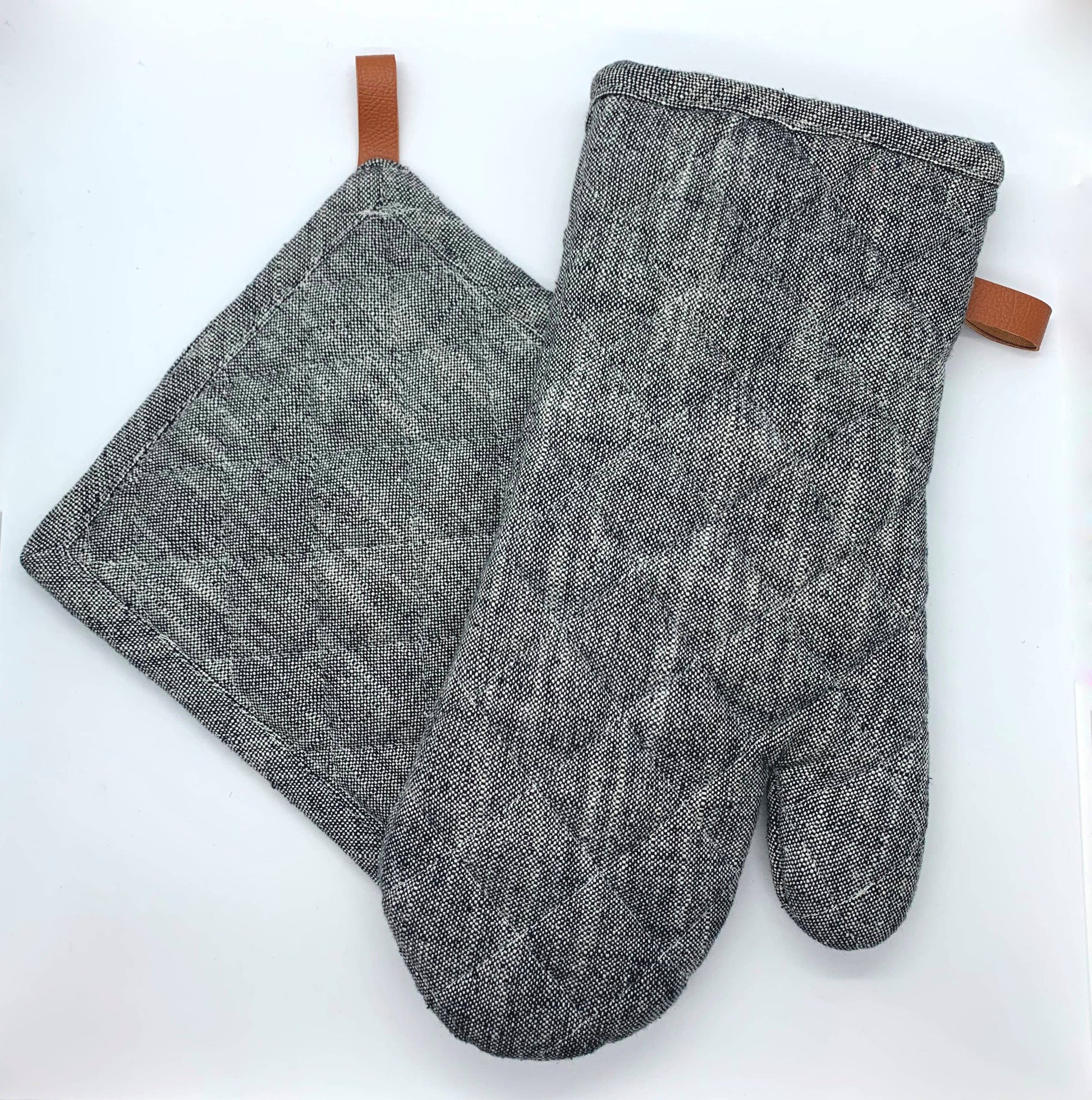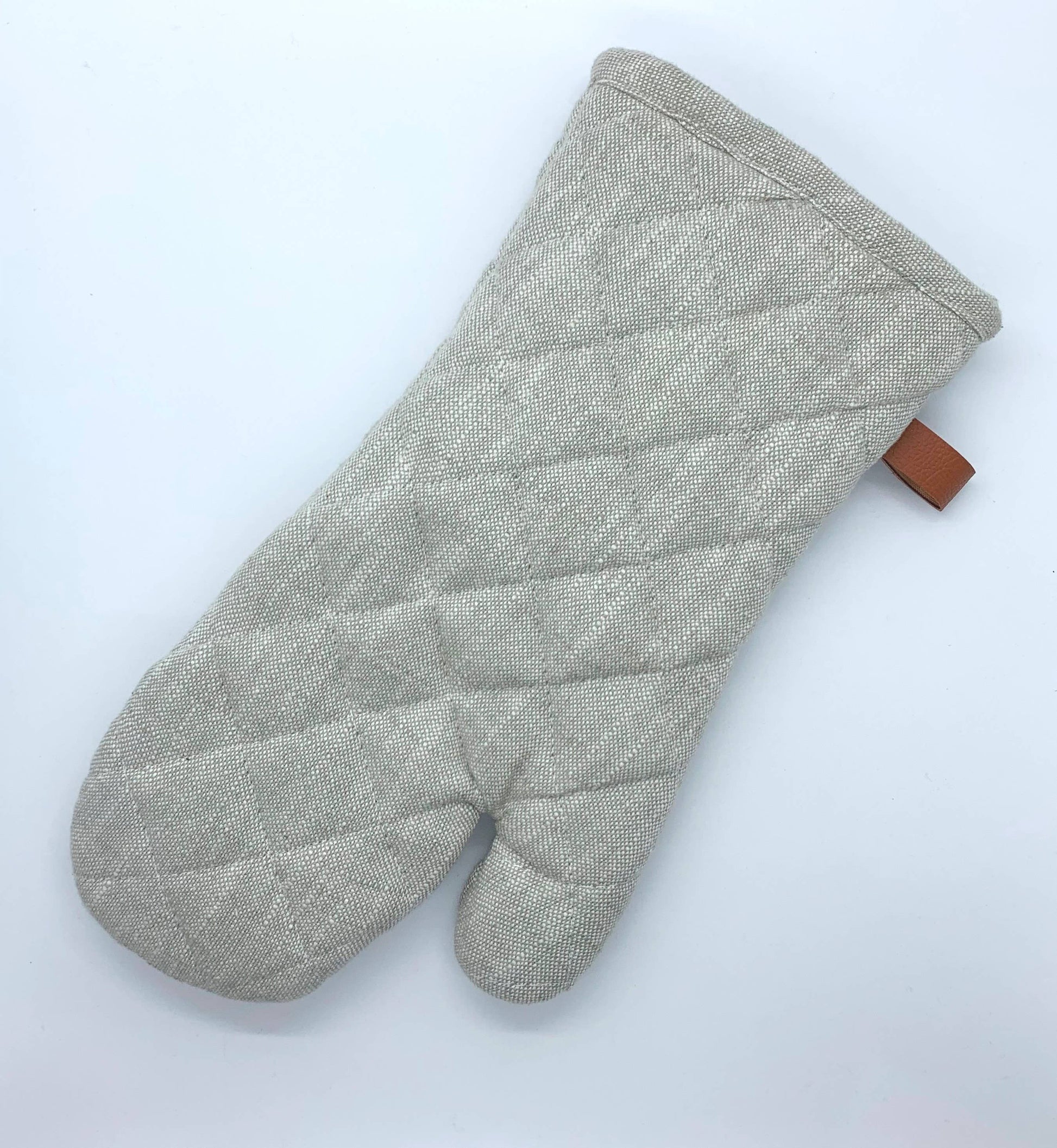 Chambray - cotton yarns weave together to create a beautifully rugged oven mitt & pot holder. The hanging loop provides a natural accent to the chunky, chambray-like fabric., for an elegantly industrial oven mitt that's built to last. This quilted mitt protects hands from hot pans and pairs perfectly with our aprons.