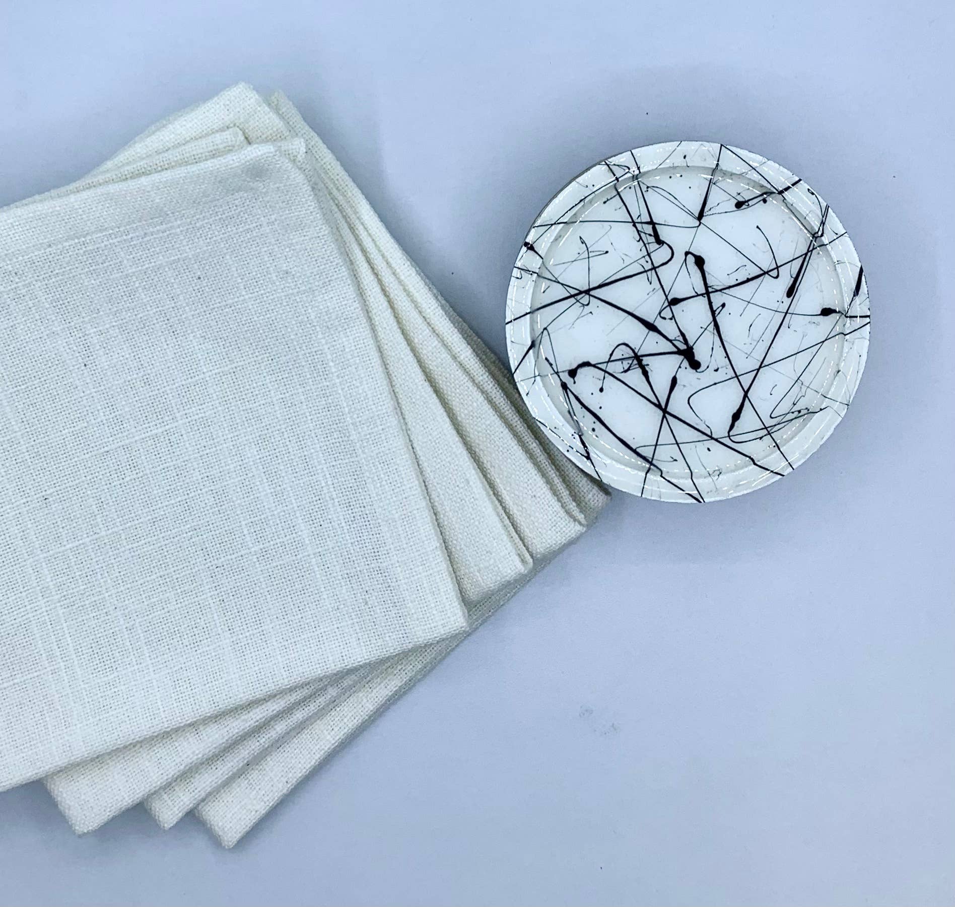 4" round Designer wood Coasters are feature raised rims to keep condensation contained and protect furniture surfaces. Four natural wood coasters are finished with designer pattern a tied with Natural set of 4 cocktail napkins for easy gifting.