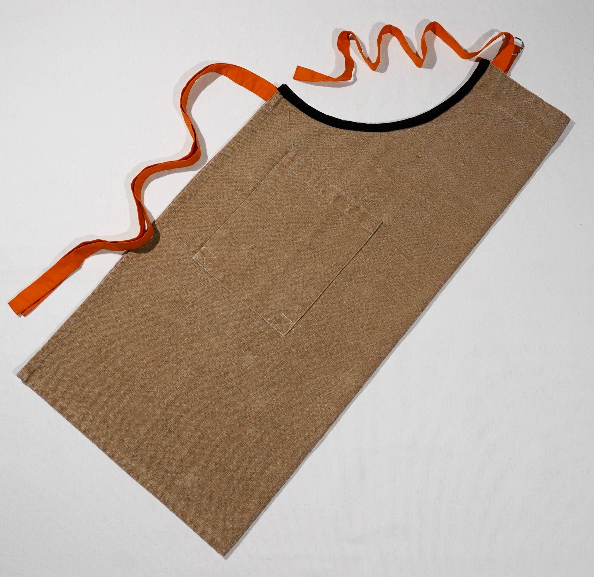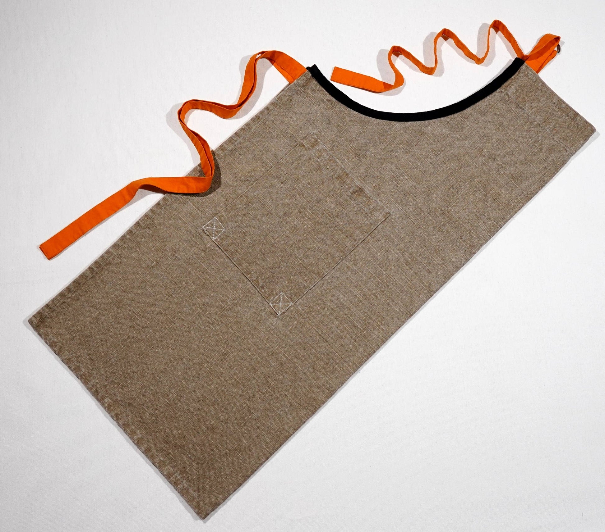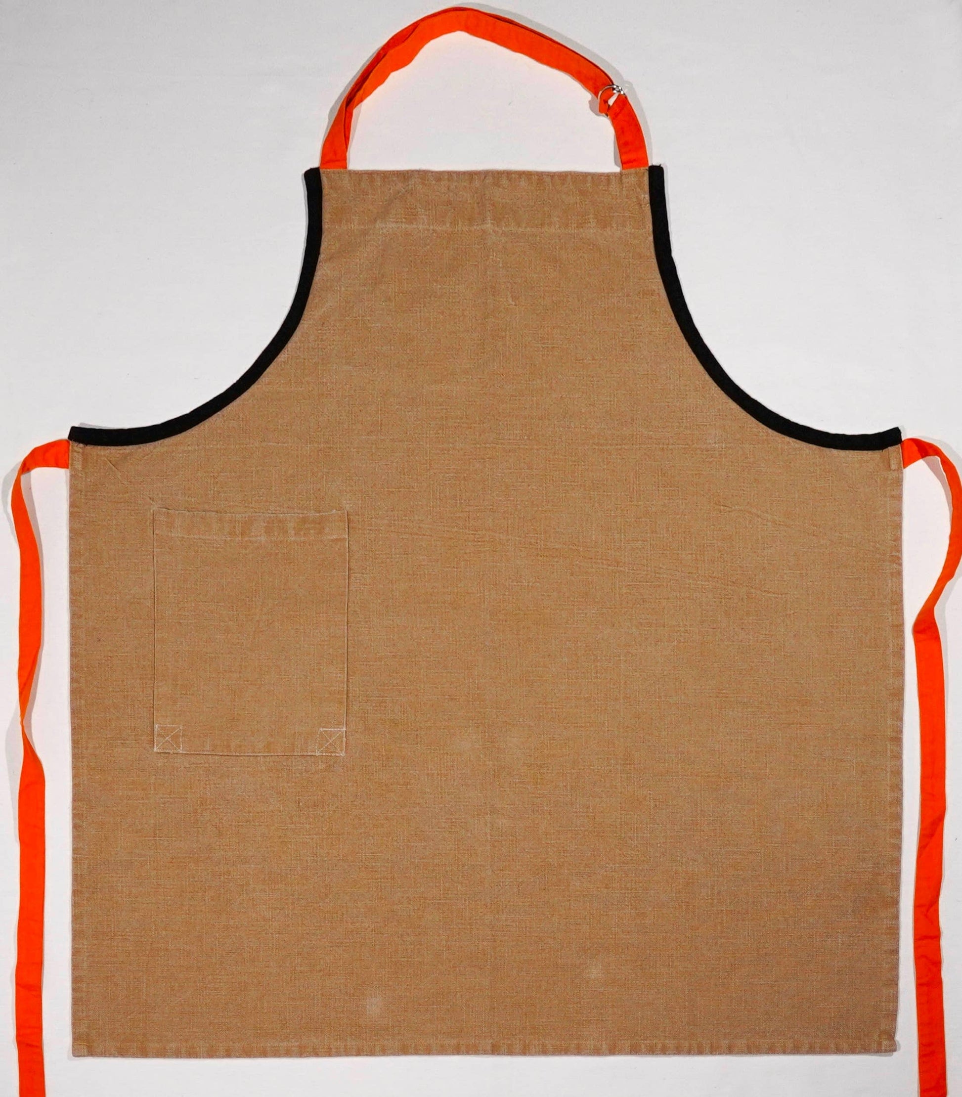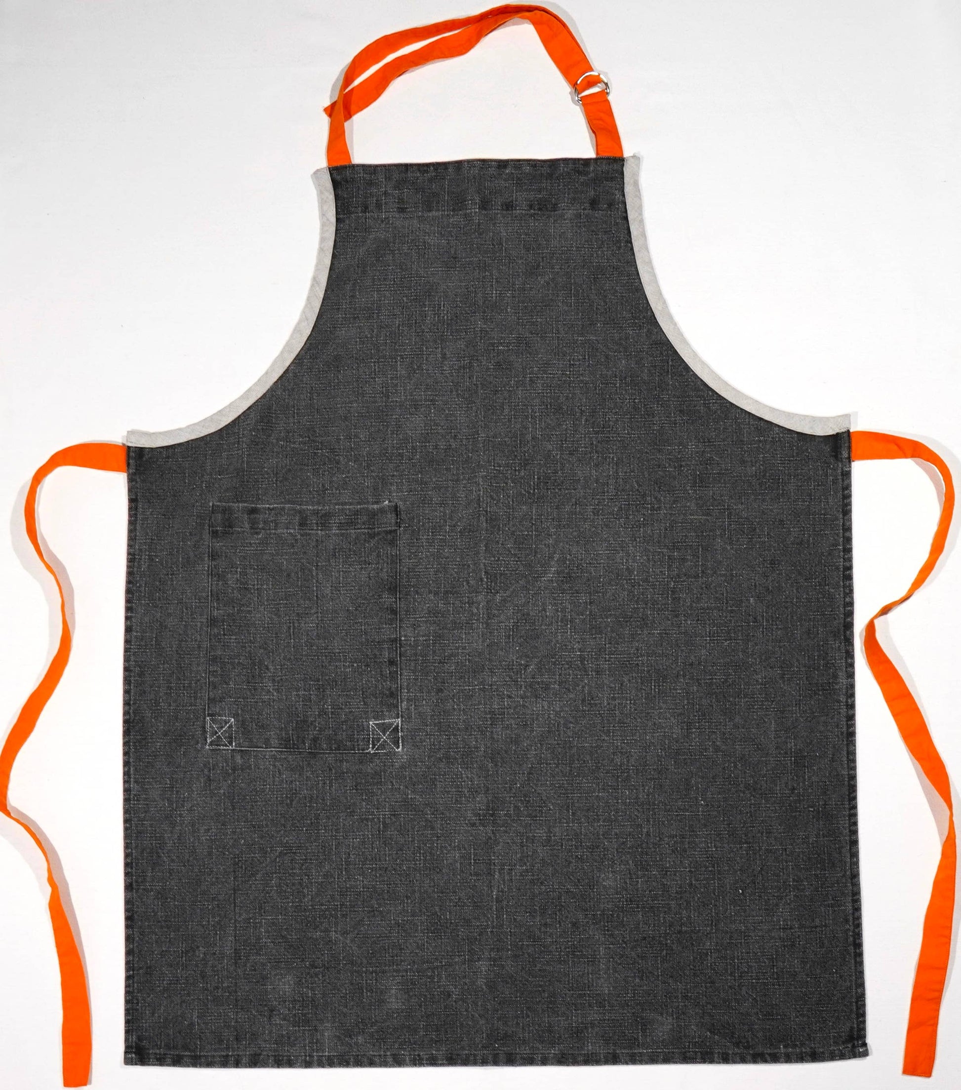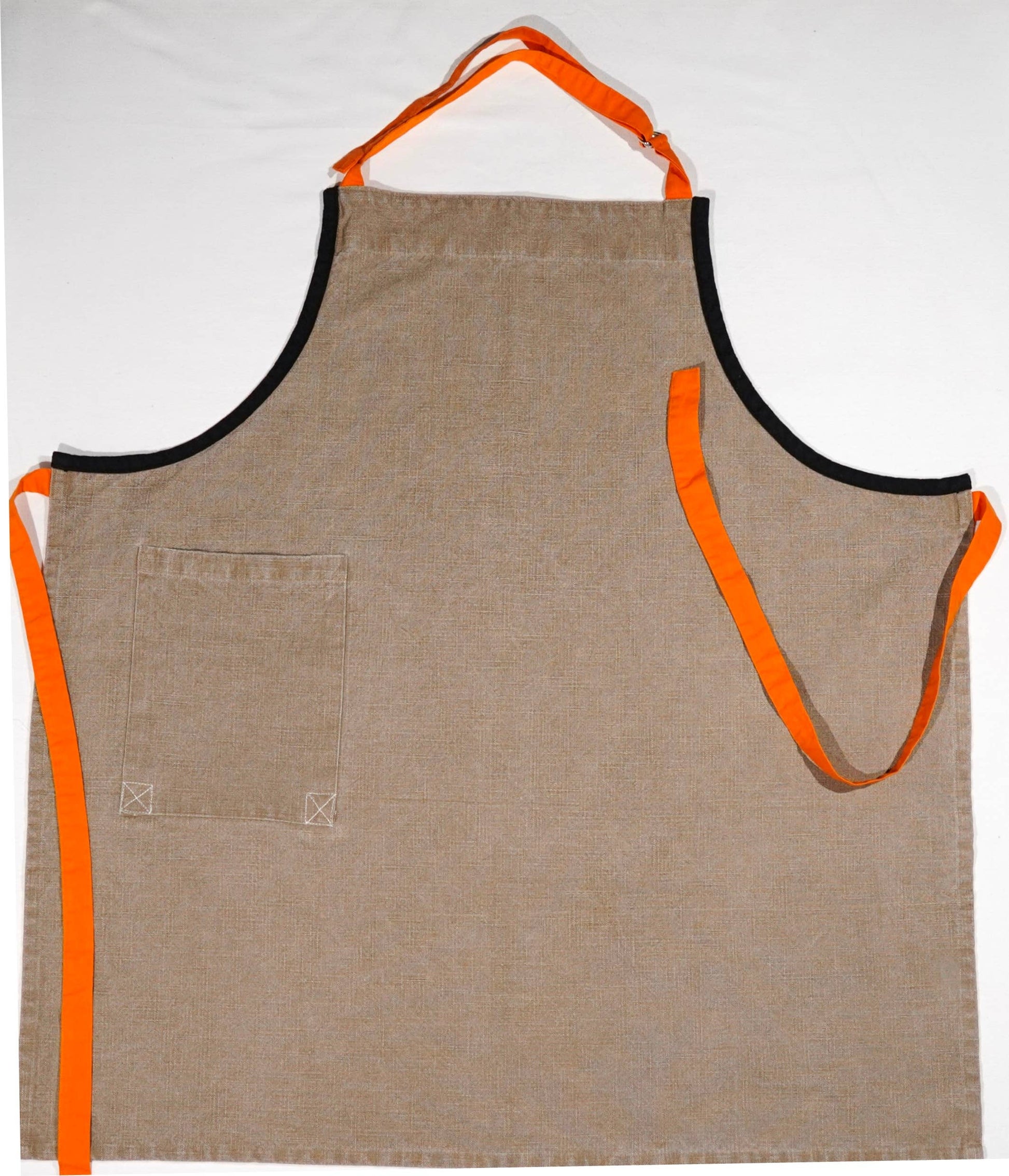 Thick cotton yarns weave together to create this beautiful apron. This apron is pre washed to give a rugged look. Solid orange loop provide contrast look to this Washed fabric, for an elegantly industrial apron that's built to last. This pure cotton apron has One Side pocket, becomes softer with each washing and pairs perfectly with our oven mitt and pot holder.